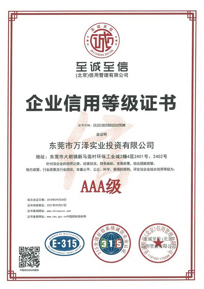 公司于2018年9月28日荣获由权威第三方信用评价机构至诚至信(北京)信用管理有限公司颁发的AAA级企业信用等级证书。充分表明了公司的信用水平和发展能力以及极强的社会责任感。