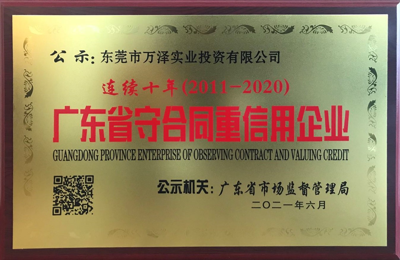 万泽实业自2011年首次获评广东省“守合同重信用”企业称号,至今已连续十年获此殊荣,是万泽实业提升企业价值与企业竞争力的宝贵无形资产。同时这也意味着社会各界及市场监管部门对万泽实业在诚信经营、企业信用体系建设以及维护合同信用等方面的充分肯定与高度认可,是我司多年来坚持以诚取信、以信立誉所取得的重要成果。 我司深知诚信经营方能行稳致远,对于此次再度获得嘉奖,必将不负荣誉,不忘初心,继续维护好诚信企业形象,履行好诚信经营社会责任,为广大客户提供更加优质的服务,争做行业标杆企业,力创下一个十年!