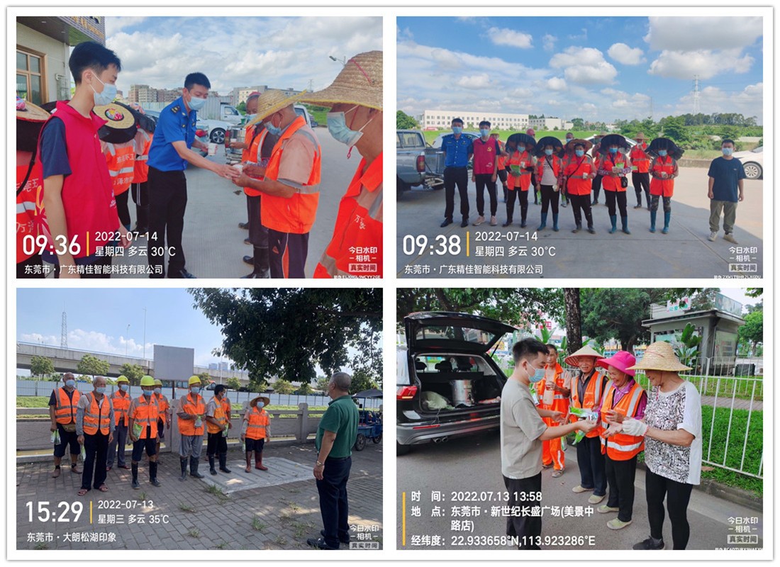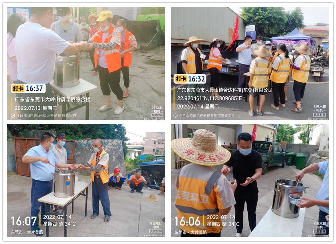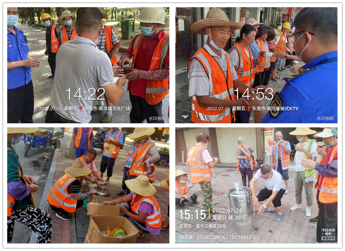 为切实做好职工夏季户外防暑降温工作,关爱一线职工的健康安全,自7月13日起,东 莞市万泽实业投资有限公司携手城管局陆续开展了“关爱环卫工 夏日送清凉”慰问活动, 为奋战在高温下的环卫工人们送上绿豆汤、凉茶、藿香正气水、清凉油等消暑物资,向他们 表示亲切的问候和衷心的感谢。同时,也不断提醒环卫工人一定要保重身体,注意防暑降温, 在保障安全的前提下做好工作。