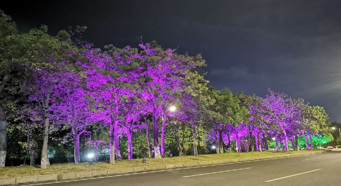 ▶ 项目描述:项目位于松山湖高新区,基于夜景现状,进行查缺补漏,补充照明暗点。对道路两旁大树辅以投光灯,增添道路景致,丰富道路夜间景观。